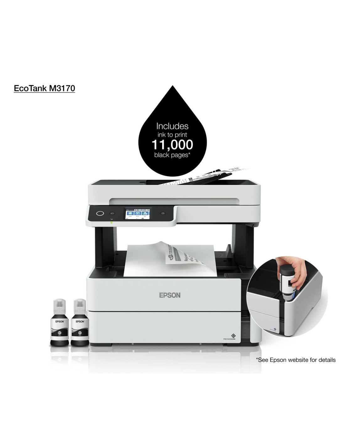 Epson - EcoTank ET-M3170 - Multifonction, impression, copie, scan, fax, jet d'encre, noir et blanc, A4, chargeur de document ADF,recto verso uniquement en impression, réseau, wifi, 20 ppm